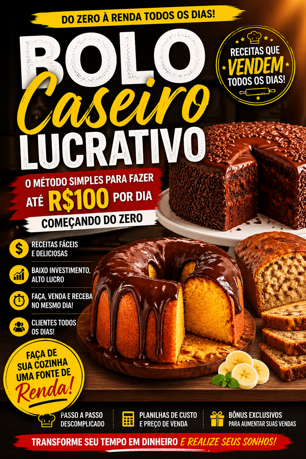 Um método prático, direto e simples para você fazer bolos deliciosos que vendem todos os dias e transformar sua cozinha em uma fonte real de renda — mesmo que você nunca tenha feito um bolo na vida.